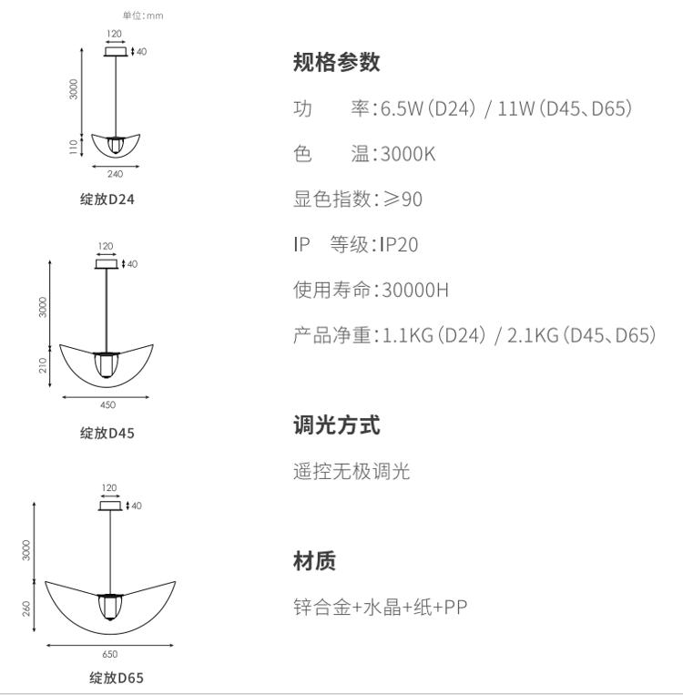利用材料物理弹性,,,透过巧妙的结构,,,,灯罩在空间里呈现一个富有张力和生机的曲面,,,仿佛在空间里热烈绽放的花朵,,,灯罩表面采用手工敷纸工艺,,,更加的朦胧舒适,,,,纸纤维的材质也让灯光更加温柔。。。选用实心高级无铅水晶材质,,这种材料洁净无瑕的透明度与低色散特性,,硬度高,,,多用于精密光学器件及高端水晶制品,,,更好展现丰富光影质感。。